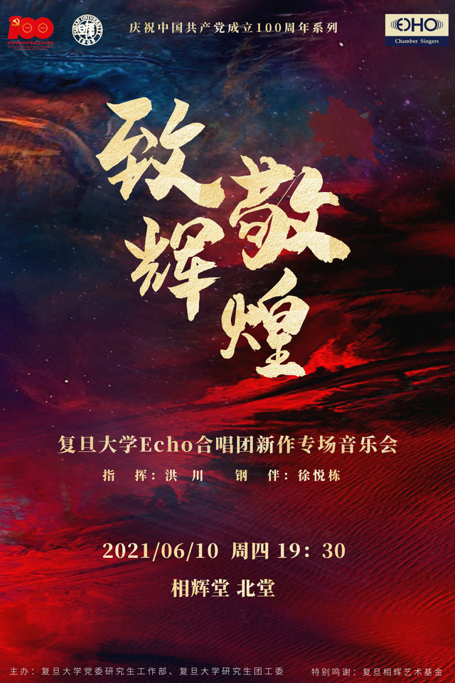 为庆祝中国共产党成立 100 周年,复旦大学 Echo 合唱团致敬辉煌新作专场音乐会将于 月 10 日(周四)19:30 在相辉堂北堂举办。本次音乐会仅面向校内师生开放,感兴趣的师生可扫码预约登记,数量有限。预约成功后将收到短信确认通知(内含领票时间和地点),领票时请出示短信与有效在校证明(校园卡等),一人限持一证领一票。联系人:黄子寒 18516241224 于骐恺 18795879578