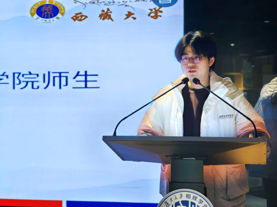 复旦大学希德书院团工委副书记郑睿祺代表希德书院学生发言。他讲述了两校以长江为纽带,跨越东西的美丽邂逅。在西藏的土地上,同学们切身感受到祖国西南独特的生态环境与人文风情,爱国情怀油然而生。他希望两校学子借助合作平台,结合各自学科背景,扎根西藏生态,深化生态保护与发展探索,共同讲好“长江故事”,续写东西部生态学科合作与生态文明建设的新篇章。