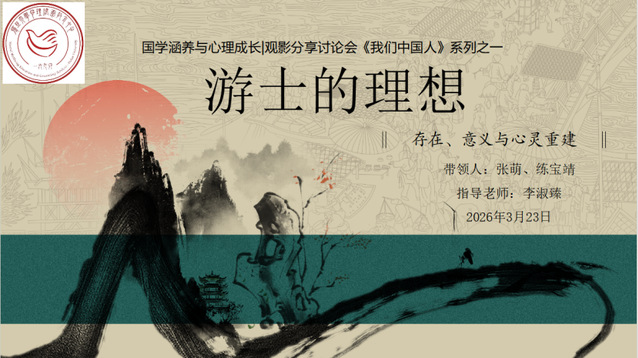 2026年3月23日晚,邯郸校区607教室,灯光柔和,座无虚席。由校心理健康教育中心推出的“国学涵养与心理成长”观影分享讨论会第一期——《游士的理想》,在春意渐浓的夜晚缓缓展开。这是一场关于理想与现实的对话,也是一次跨越千年的心灵相遇。